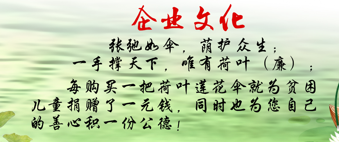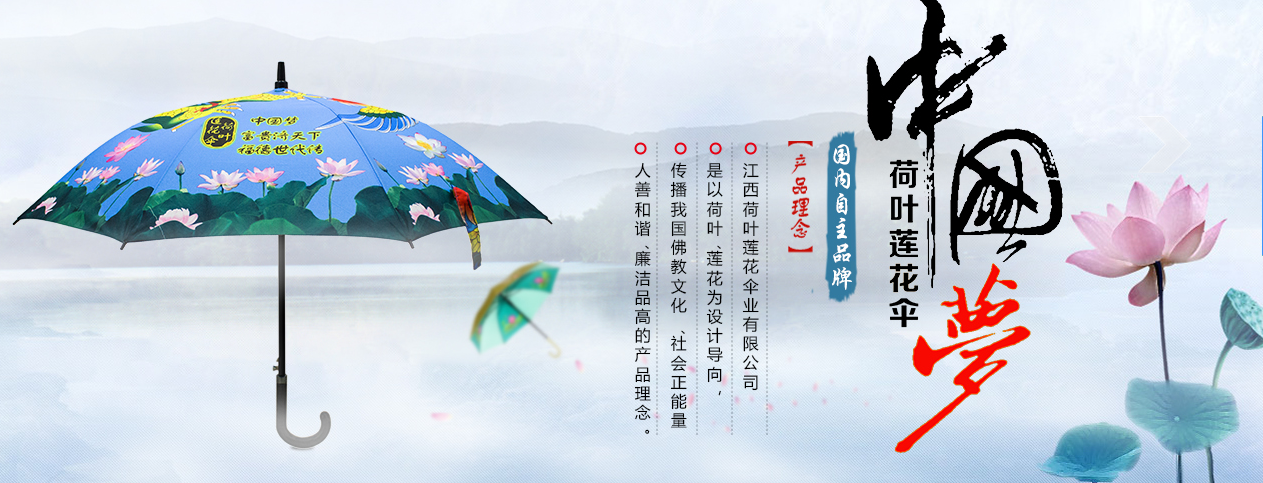 江西荷叶莲花伞业有限公司成立于2015年,由南昌市福泉节能科技有限公司、江西旺天实业有限公司、佳丽集团(国际)有限公司、江西斑马电子商务有限公司共同投资打造。以互联网十的思维,通过线上商城与线下代理商(会员)体验销售的方式,为广大消费者提供优质而便捷的产品服务,是一家产品以“荷叶莲花伞”品牌进行生产及开发设计销售为一体的大型伞类企业,产品主要有雨伞、太阳伞、环保类伞(竹纸古典伞、竹木纱巾古典伞、竹木古典蚕丝伞) 、广告伞、外贸伞,广告帐篷等。公司也是很多星级酒店,银行,房地产,旅游,高尔夫,礼品广告公司,汽车4S店的指定供应商。